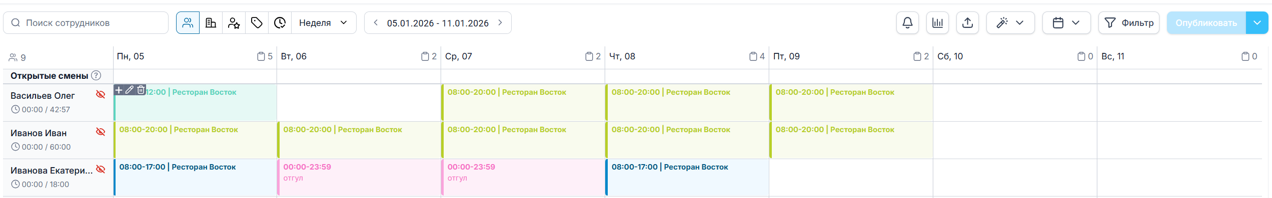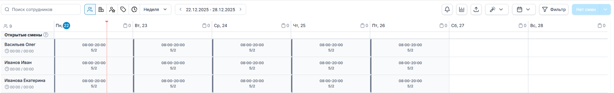 Плановые смены — это смены, которые назначаются на сотрудников с заранее определёнными графиками работы (5/2, 2/2, 3/3 и т.д.). В системе они отображаются серым цветом.
