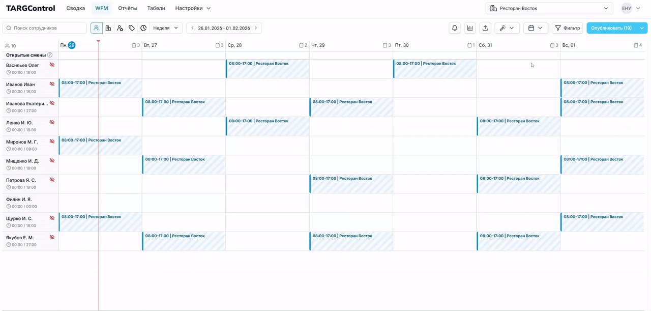 • Оптимизация: Вы создали идеальную сетку смен, но хотите, чтобы система заново распределила их через Автопланирование с учетом актуальных Доступностей сотрудников.