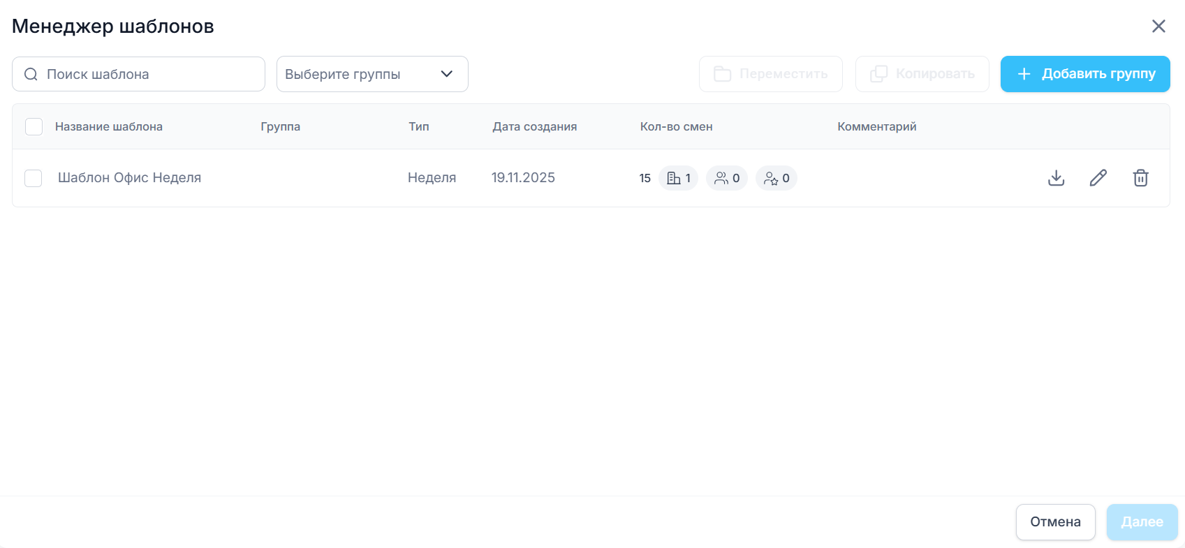 Тип шаблона: Выберите, что сохраняете: смены всей недели или смены только за один день.