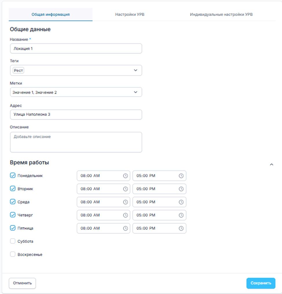 Для создания локации в организации перейдите во вкладку WFM -> Настройки -> Локации и нажимаем Добавить локацию.
