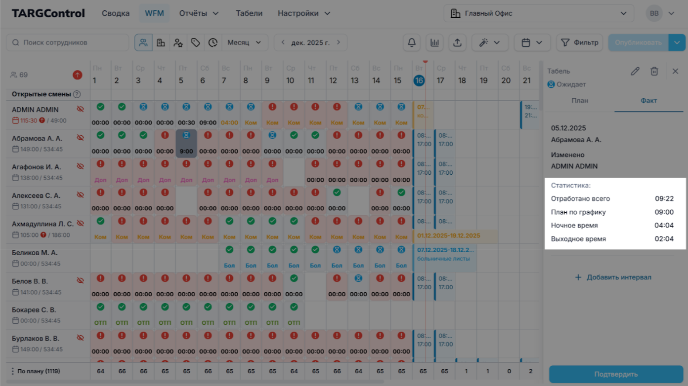 Показывает фактическое количество времени, которое сотрудник отработал за день, с учётом всех интервалов, согласований и корректировок.
