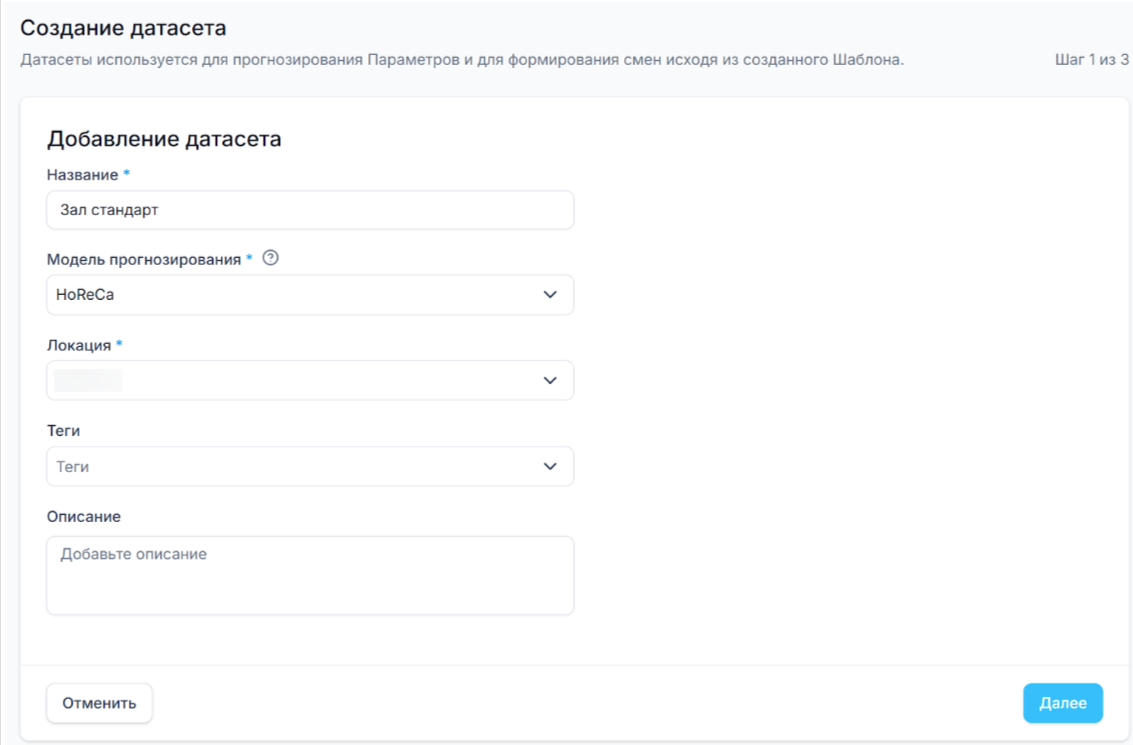 На вкладке Датасеты нажмите Добавить датасет, укажите название, выберите модель прогнозирования и задайте локацию, к которой он будет применяться. Даже внутри одной компании разные точки (локации) могут работать по разным сценариям, и датасет позволяет учитывать это.