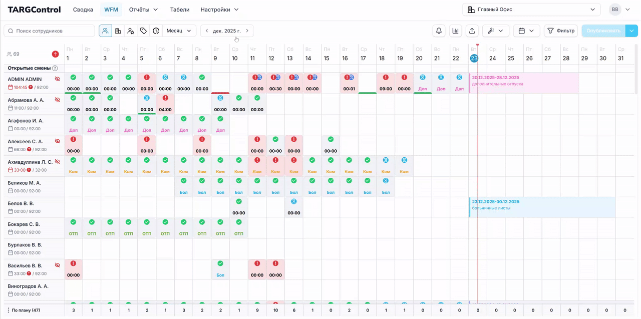 События табеля — это специальные отметки в графике, которые обозначают запланированное или фактическое отсутствие сотрудника на рабочем месте по уважительным причинам. К ним относятся отпуска, больничные, отгулы и другие нерабочие периоды.