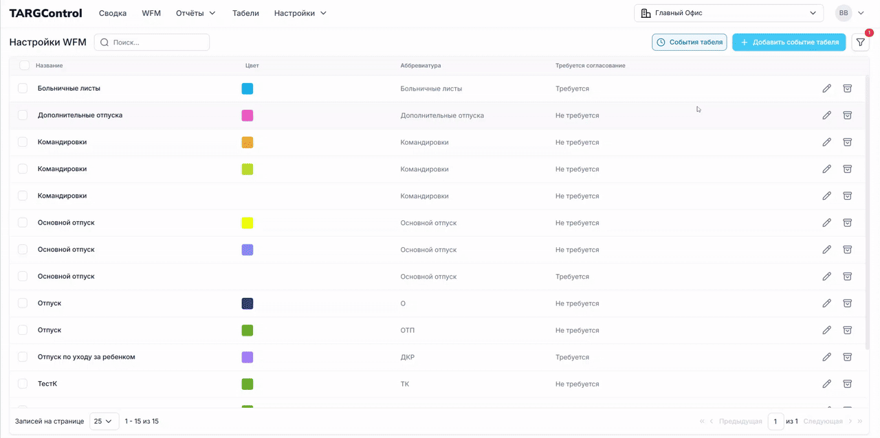 3. Выберите подраздел События табеля. Здесь вы увидите список всех уже созданных категорий событий (например, «Больничный», «Ежегодный отпуск»).