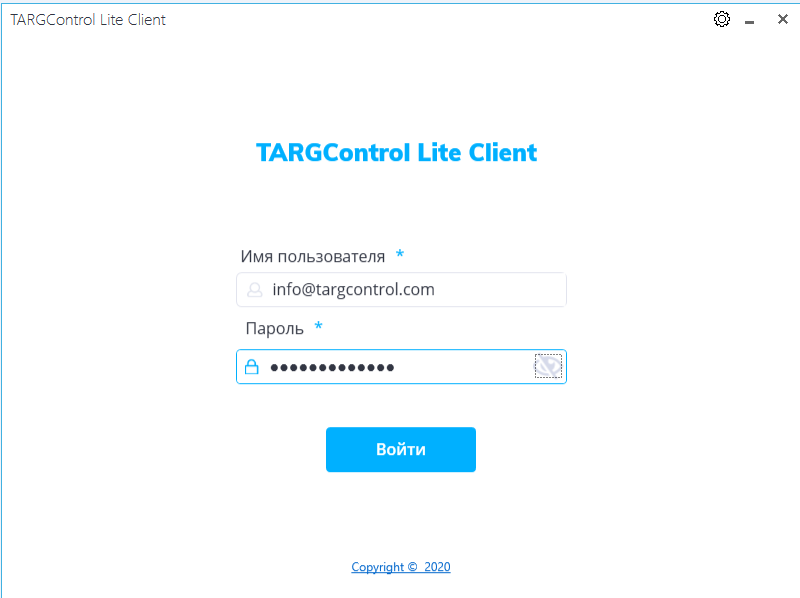 После перезапуска приложения выполните вход в систему TARGControl при помощи логина и пароля, указанного при регистрации в системе.